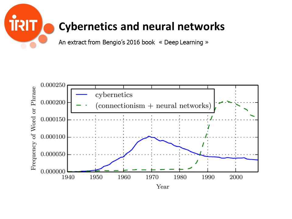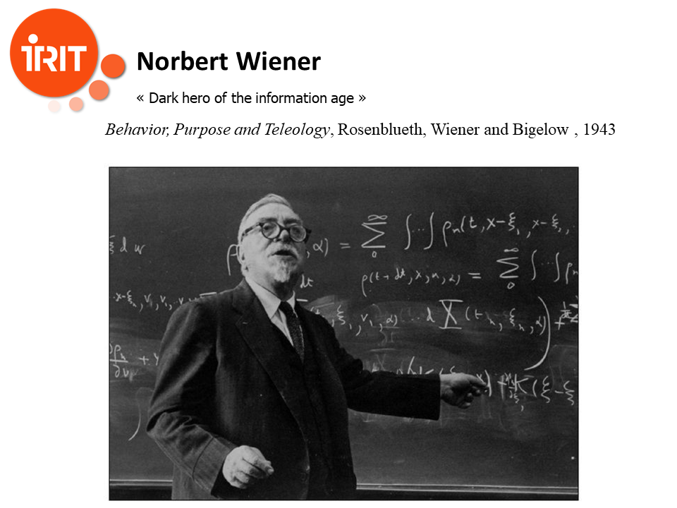 While preparing this talk, I was reading two books at the same time. One quite technical by Joshua Bengio on Deep Learning, while the other one was the biography of Norbert Wiener. And the two books collided quite strangely. Bengio presents that very interesting figure in his book. For Bengio, cybernetics is the grand father of the neural networks revolution. And as you might know, the inventor of cybernetics was Norbert Wiener.
