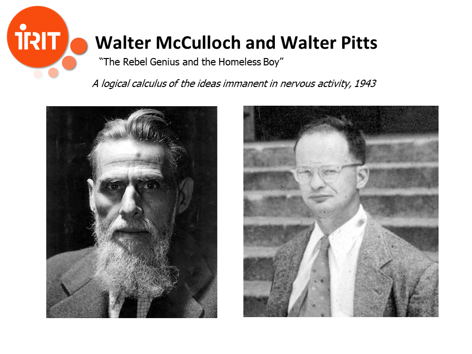 McCulloch was a neuropsychiatrist, a philosopher and a poet. He was coming from a well-to-do family, drank a lot, ate ice creams, was a radical who listened to Spanish revolutionary songs and lived a free life with his wife Rook. In 1942, he had attended one of the Macy conferences, and had been stricken by a presentation of Arturo Rosenblueth, a very close associate of Wiener, about feedback mechanism in the brain. Then he began to try to model the activity of the brain using a logical model. He was introduced to Walter Pitts by a common friend, Jeremy Lettvin, a MD student. When they met McCulloch was in his forties, while Pitt was only 19, and was doing menial jobs around Chicago university while following the group of Nicolas Rashevsky, a Russian mathematician who was trying to apply mathematics to biology.