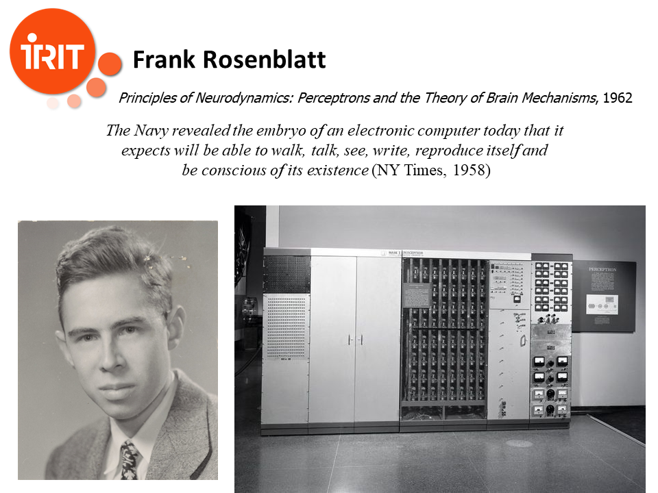 All these ideas were still popular in the fifties and the sixties and in 1962, Frank Rosenblatt published his book “Principles of Neurodynamics: Perceptrons and the Theory of Brain Mechanisms”. Rosenblatt was able to secure funding from the Navy and he built an ad-hoc machine, the Mark I perceptron. Perceptrons are binary classifier, and the Mark I was a machine designed for image recognition. The subject was an active one at the time, and there were many teams working on it in different institutions, until the publication of the famous “Perceptrons” book by Minsky and Papert in 1969.