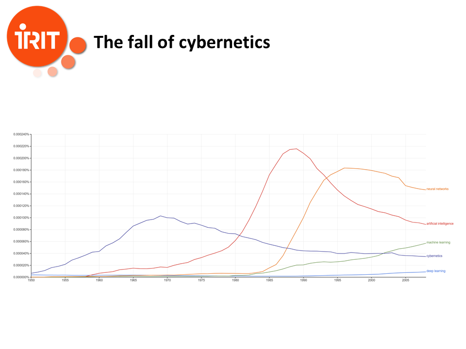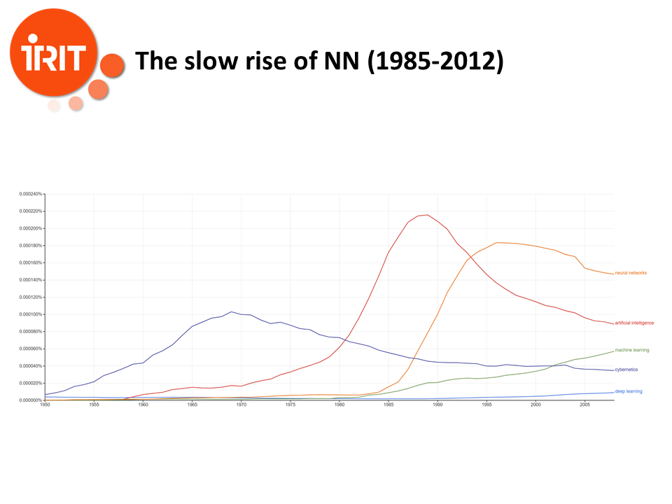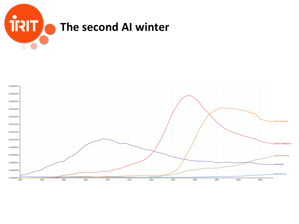 In these slide, we see the statistics on the occurence of the words "neural networks", "artificial intelligence", "machine learning", cybernetics" and "deep learning" in books. And we see that AI had already began to enter its second winter in 1988, and it would last 20 years.