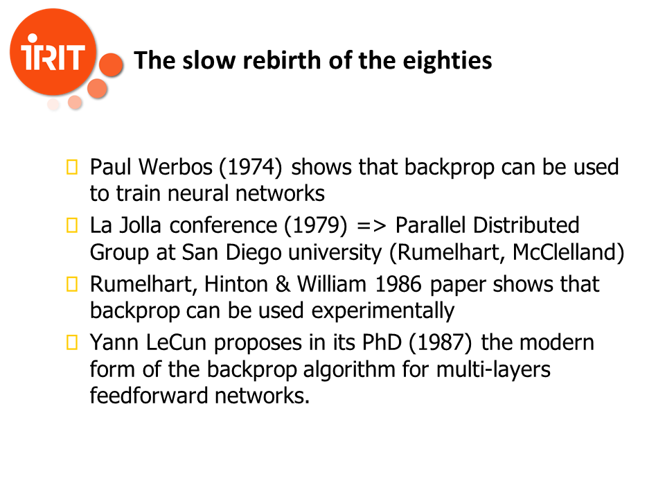 The field began to resurface in the eighties. There was a conference in La Jolla in 1979, and then the constitution of a group of researchers at San Diego university, with David Rumelhart. Then, first with the work of Paul Werbos in 1974 and later with the articles of Rumelhart and his team, the backpropagation algorithm was shown to be able to train feedforward fully connected neural networks. In 1987, under the supervision of Françoise Fogelman-Soulié, Yann LeCun in his PhD defined the modern form of backprop.