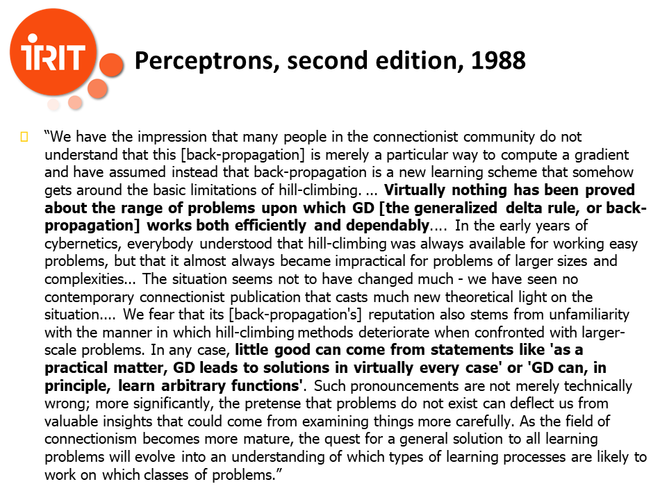 We have the impression that many people in the connectionist community do not understand that this [back-propagation] is merely a particular way to compute a gradient and have assumed instead that back-propagation is a new learning scheme that somehow gets around the basic limitations of hill-climbing. ... Virtually nothing has been proved about the range of problems upon which GD [the generalized delta rule, or back-propagation] works both efficiently and dependably.... In the early years of cybernetics, everybody understood that hill-climbing was always available for working easy problems, but that it almost always became impractical for problems of larger sizes and complexities... The situation seems not to have changed much - we have seen no contemporary connectionist publication that casts much new theoretical light on the situation.... We fear that its [back-propagation’s] reputation also stems from unfamiliarity with the manner in which hill-climbing methods deteriorate when confronted with larger-scale problems. In any case, little good can come from statements like ’as a practical matter, GD leads to solutions in virtually every case’ or ’GD can, in principle, learn arbitrary functions’. Such pronouncements are not merely technically wrong; more significantly, the pretense that problems do not exist can deflect us from valuable insights that could come from examining things more carefully. As the field of connectionism becomes more mature, the quest for a general solution to all learning problems will evolve into an understanding of which types of learning processes are likely to work on which classes of problems.