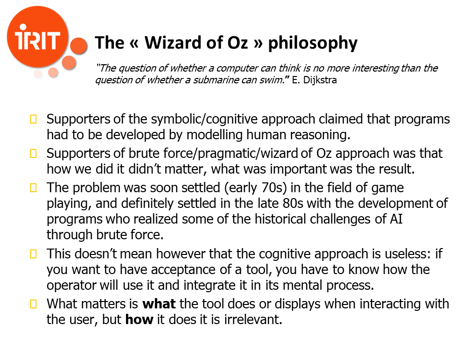 During these 20 years however, some problems which were considered as AI were solved, such as the historical victory of DeepBlue against Gary Kasparov in 1997. The third branch of AI, that I would call pragmatist AI, or brute force AI, was on his way. Its motto was “what matters is what you do and not how you do it”. There is a famous quote by Dijkstra that said that “the question of whether a computer can think is no more interesting as whether a submarine can swim”. The philosophy behind it was sometimes also called the “wizard of Oz” philosophy, as a reference to the character in the movie of the same name, who does not perform any actual magic trick, but makes people believe that he does. What matters is what the tool does or display when interacting with the user, but how it does it is irrelevant.