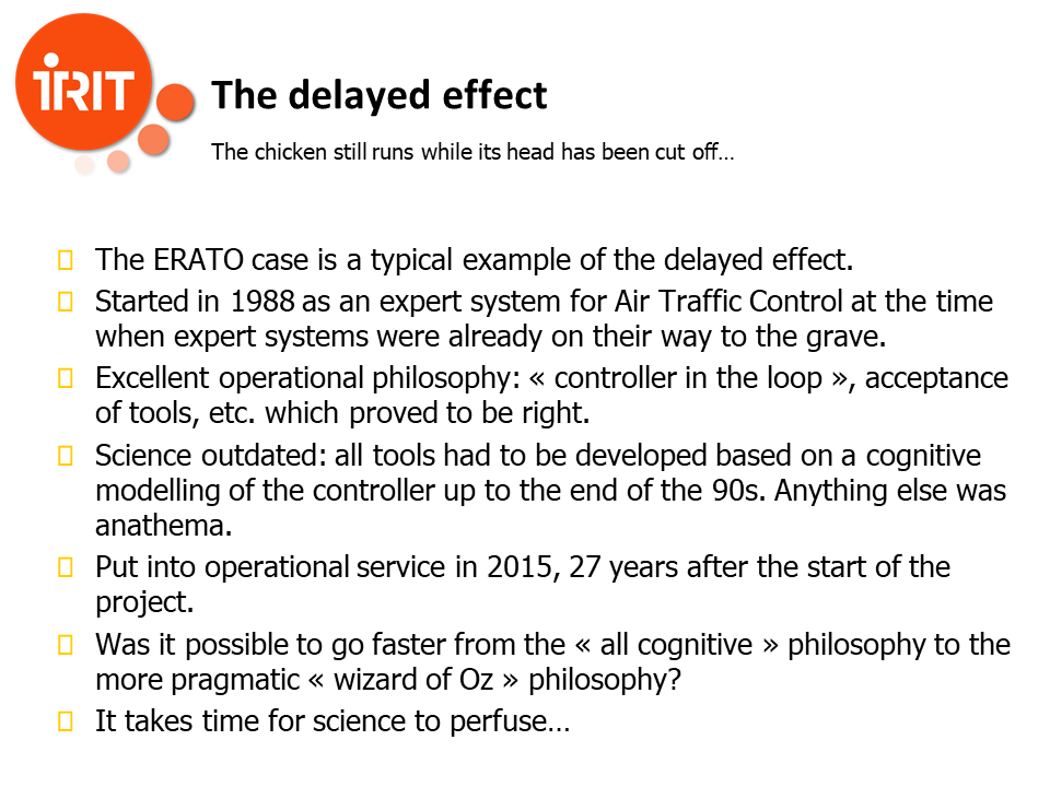 Now, I am going to speak about a very interesting phenomenon, that I call the delayed effect. While in the scientific community the times of expert systems and cognitive modeling were gone forever, this was not the case in all communities, and especially inside the ATM french community. In 1988, the french CENA started a project called ERATO. I remember very well the exact date because I did my ENAC master dissertation on ERATO in 1988. ERATO was to be an expert system for air traffic control, based on a cognitive modeling of the controler. Behind ERATO was an air traffic controller who remained in charge of the project till the late nineties. ERATO was created at a time when there was quite a controversy in the ATC community. On the one hand, we had the US AERA project, with a third phase, AERA3, which was supposed to be a fully automated system, with the air traffic controller being only a system manager. On the other hand, there was the “controller in the loop” philosophy, which was championed by the French. I presume that behind the differences in philosophy there was also political reasons, that can be found in the way controllers strikes were handled in the US and in France in the seventies and in the early eighties, when Ronald Reagan fired 90% of the American air traffic controllers after the great strike of 1981.