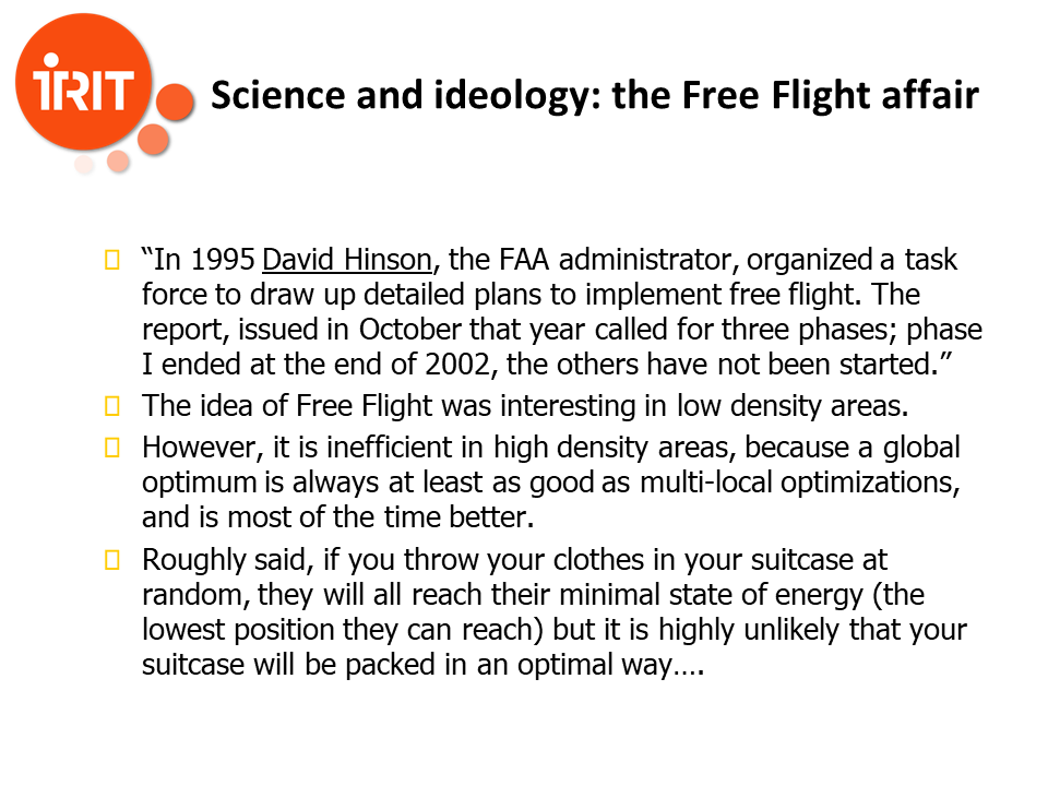 We had another interesting example of this “all-or-nothing” approach in ATM, in the late 90s. The FAA began to promote a concept known as Free Flight. The idea was that aircraft would be responsible to provide self-separation. While Free Flight was an interesting idea for low density areas, it is a mathematical nonsense in high density zone. It is quite easy to understand without a lot of mathematical demonstrations that global optimization is more efficient than multi local optimization. If you throw you clothes into your suitcase at random, they will all reach their minimal state of energy (the lowest possible position), however it is highly unlikely that your suitcase will be optimally packed.