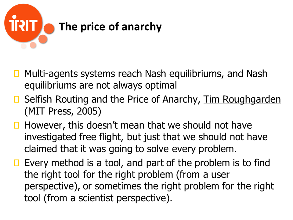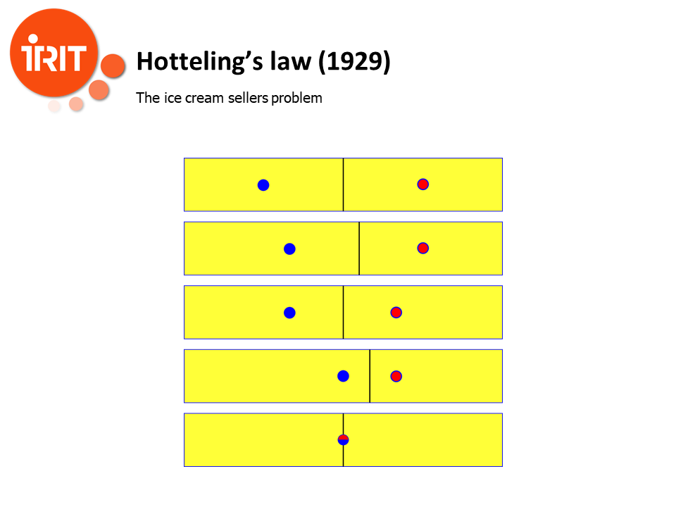 In fact, this problem is well known in a very large set of problems, such as Hotteling’s law in economy, with the classical example of the ice cream sellers problem. Here two ice cream sellers are on a beach. The initial position on the upper part of the slide is the “optimal” one, in the sense that people on the beach have at most to walk a quarter of the beach to reach the nearest ice cream seller, and each ice cream seller has half of the available clients. However what happens if the blue seller is smart? He will soon see that, by installing his stand closer to the centre of the beach, he will steal some of the clients of the red seller. In turn, the red seller will move closer to the centre, until each seller reaches the centre, which is a Nash equilibrium. Now they still have half of the clients, but some people have to walk half of the beach to reach their seller. If you ask a Chicago School economist about this, it will explain it in terms of “negative externalities”. The reality is that sometimes you need a regulator to reach the optimum.