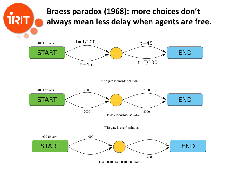 The same thing happens in networking, a problem much closer to us, with Braess paradox. Here we have 4000 drivers who have to drive from START to END, passing through the middle yellow point. The time to travel on each segment is indicated on the upper part of the slide. For example, the time to travel from start to middle on the upper road is equal to the number of drivers on this road divided by 100, while the time from START to middle on the lower segment is fixed, and is equal to 45 minutes. In the middle part of the slide, we have the “gate is closed” solution. Drivers, if they choose to take the upper road from START to middle, must remain on the upper road from middle to END (resp. on the lower one). The Nash equilibrium is reached when there are 2000 drivers on each road, with a total time of 65 minutes for each driver. However, on the lower part of the slide, the drivers have the choice to change from upper to lower, or from lower to upper at the middle point. And here, the Nash equilibrium is reached when there are 4000 drivers on the upper segment from START to middle, and 4000 drivers on the lower segment from middle to END, with a total travelling time of 80 minutes (to convince yoursel of this, try to change the path of one driver, and you will see that its travelling time will be longer whatever path he chooses, so he has no incentive to modify his choice)! Here, adding roads to a network or opening new crossroads will result in longer delays instead of shorter ones if the agents are free to choose the road they want, and this paradox has been observed on real road networks.