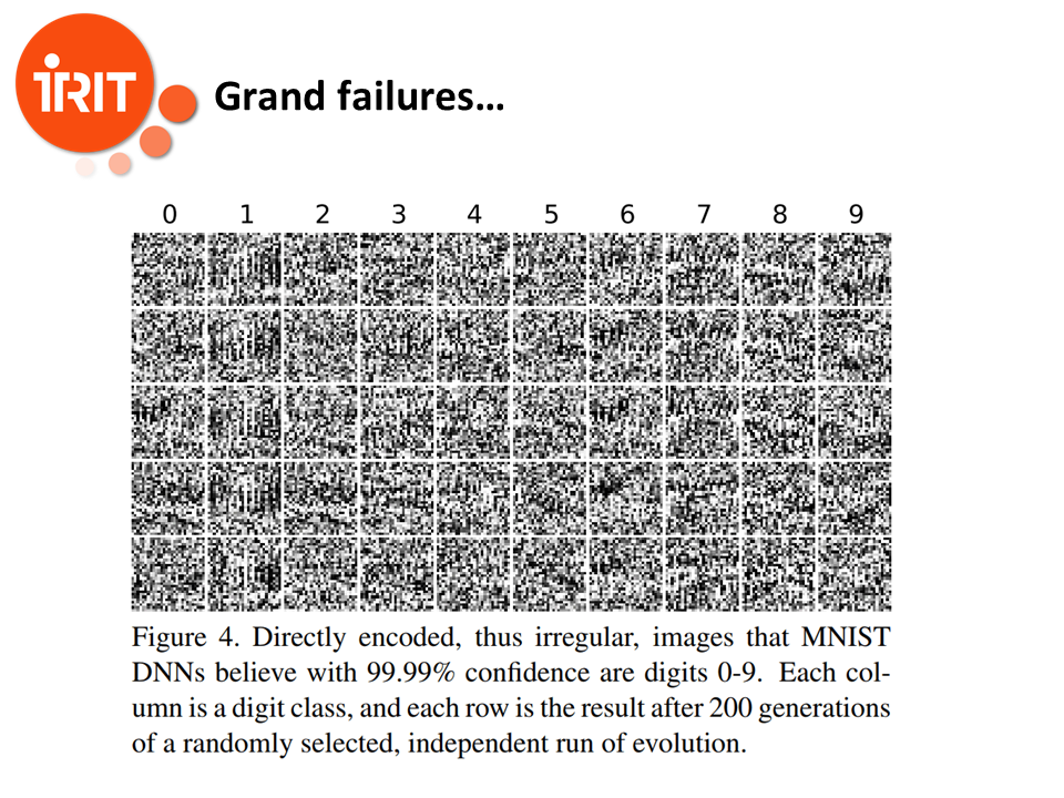 Well, we have already a very large panel of examples where NN fail miserably, for example in image classification. Here a NN thinks that he recognizes numbers where there is apparently only noise.