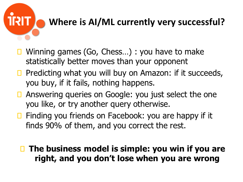 So where are they really efficient? There is a clear business model, which is working well: neural networks are efficient when failure has no consequence and success is rewarding. There are classical examples of this: games, because statistically making better moves than your opponent is enough. Purchase suggestion, because if it is irrelevant, you just don’t buy, but you wouldn’t have bought anyway, while if the suggestion is relevant you buy, and thus the company makes more money. You have also search engine queries, or finding friends on Facebook, or automatic translation on Google. For all these examples, failure is not a problem. And even more, people don’t expect the system to be perfect.