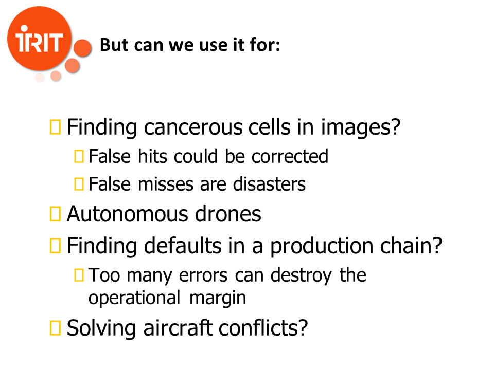 But what happens if you want to apply neural networks for cancerous cells detection? False hits can be corrected, but false misses might cost the patient his life. And what for autonomous drones, for finding defaults in a production chain, or even for solving aircraft conflicts? Here, failing is a serious problem.