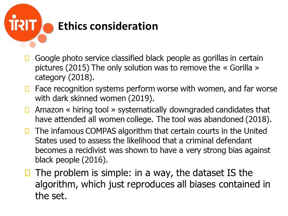 There are also biases and ethics problems which became apparent in the last years. Google algorithm for image classification had racist biases, such as sometimes recognizing black persons as gorillas. And solving the problem apparently required to remove the gorilla category. Image recognition systems are the most efficient with white males, and the less efficient with dark skin females. Amazon hiring system was discriminating women. And the COMPAS algorithm used in some justice courts in the United States for predicting the capacity of recidivism was show to exhibit a strong and unfair bias against black people. The central problem is that the dataset is the algorithm. If there are biases in the data, there will be biases in the algorithm, and detecting biases is very difficult.