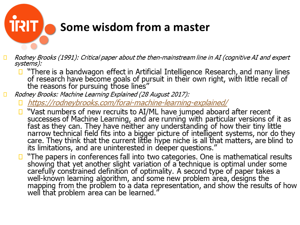 I will end this talk with these quotes from Rodney Brooks, an old master of the AI field, who was always both a critic and a creative researcher.