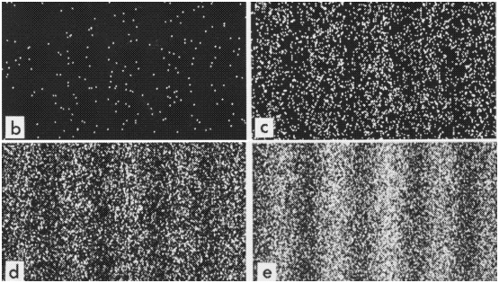 En 1989, une expérience réalisé par le professeur Tanamura permettra de parfaitement visualiser ce double aspect de la lumière. En bombardant individuellement avec des photons une plaque, elle permet de montrer l’apparition lente des figures d’interférence de Young (voir figure 2.2).