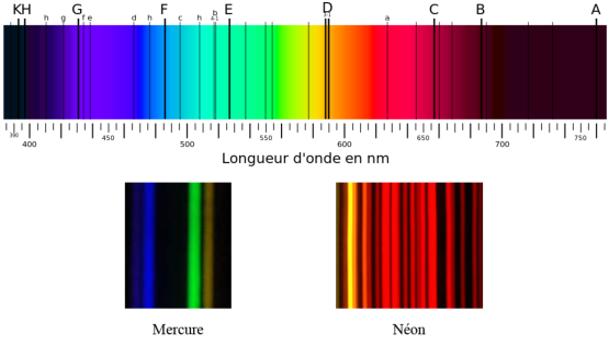 Ce phénomène avait jusque là été mal compris; Newton le premier avait découvert que la lumière blanche se décomposait avec un prisme en un ensemble de couleurs qui restaient les mêmes quelle que soit l’orientation du prisme ou son matériau. Mais la première observation d’une raie spectrale est faite pas Thomas Melvill en 1752 (le jaune du sodium). Ces observations seront complétées au fil des années par William Wollaston, Joseph Von Fraunhofer, Gustav Kirchhoff et Anders Angstrom. On peut voir sur la figure 2.3 les spectres respectifs du mercure et du néon, ainsi qu’une décomposition spectrale complète du spectre visible telle que faite par un prisme.