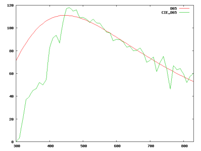 Comme l’avait démontre Newton, une radiation lumineuse est entièrement déterminée par son spectre de puissance. On peut voir sur la figure 2.4 la représentation du spectre de puissance de la lumière “blanche” du soleil reçue sur terre après filtrage par l’atmosphère terrestre, et l’émission d’un corps noir à une température de 6500K. Pour chaque longueur d’onde, on représente la puissance émise pour cette longueur d’onde. C’est le type d’analyse qu’effectue un spectromètre, et c’est la seule définition correcte d’un rayonnement lumineux. Nous allons voir que l’œil humain est bien incapable de fonctionner ainsi.