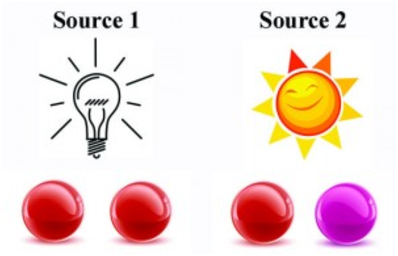 La seconde version, tout aussi surprenante, est qu’un même objet peut avoir des couleurs différentes suivant des éclairages qui semblent pourtant être de la même “couleur”. Ces phénomènes ne peuvent s’expliquer en termes de longueur d’onde: un spectromètre ne serait d’ailleurs pas trompé par les exemples ci-dessus. Dans le premier cas, il distinguerait que les deux objets émettent bien des rayonnements différents quel que soit l’éclairage, et dans le second cas il distinguerait clairement les deux éclairages, qui ne sont semblables que pour un œil “humain”.