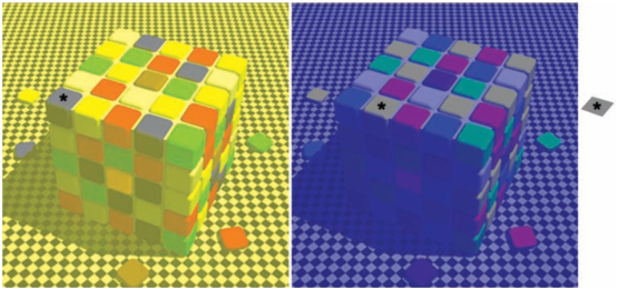Enfin, il y a d’autres illusions visuelles tout autant inexplicables par la théorie classique, et même par la théorie de Herring. Le cerveau a ainsi une capacité exceptionnelle à gommer les différences d’éclairage. Par exemple, que l’on regarde une pomme au soleil ou sous un éclairage fluorescent, elle semblera de la même couleur alors qu’un spectromètre (ou un appareil photo!) mesurerait des valeurs extrêmement différentes. Ce mécanisme, appelé constance de la couleur (“color constancy” en anglais), est fortement implanté dans le traitement cérébral de l’information. Il est d’ailleurs possible de le tromper en construisant des scènes où ces capacités inconscientes d’interprétation sont prises en défaut, à tel point qu’il est impossible de s’en défaire même lorsqu’on connaît le “truc”, comme sur la figure 2.7: les trois facettes marquées d’une étoile sont techniquement exactement de la même couleur: grises. On peut s’en convaincre avec un logiciel de traitement d’image en mesurant les composantes RGB des trois facettes. Pourtant, elle parait jaune dans un environnement bleu, bleue dans un environnement jaune et grise seulement dans un environnement blanc. Il est impossible d’échapper à l’illusion, même en essayant consciemment d’y résister.