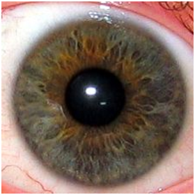 L’iris est la partie colorée de l’œil. C’est un voile très fin formé de lamelles pigmentaires qui donnent leurs couleurs aux yeux. Plus ces pigments contiennent de la mélanine ,qui a pour but de colorer, plus l’œil est foncé. Il règle la dilatation de la pupille en fonction de la luminosité reçue (voir figure 3.2). Pour certains yeux verts, la molécule responsable de la couleur est la lipofuscine. En l’absence de pigments (albinisme), l’œil prend la couleur du sang qui y circule: c’est à dire rouge. Il existe toutes les nuances possibles et imaginables de couleur d’iris, des plus communes aux plus rares. Certains sont même composés d’une multitude de couleurs, et donc distinguer la couleur dominante est parfois très difficile. Il est d’ailleurs parfois impossible de discerner une couleur dominante tant il y a de nuances.