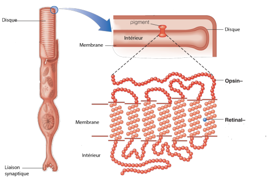 La structure globale des cônes et des bâtonnets est à peu près la même; on voit sur la figure 3.4 la structure précise d’un bâtonnet.
