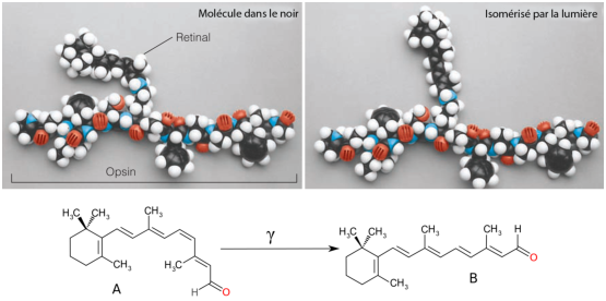 En l’absence de lumière, le rétinal existe sous forme cis. Lorsqu’il reçoit un photon, il s’isomérise en forme trans. C’est cette réaction qui va entraîner le blocage de l’émission du neuro-transmetteur de la cellule. En effet, chez les vertébrés, et l’homme en particulier, les cônes et les bâtonnets sont des cellules inhibitrices: elles libèrent un neuro-transmetteur quand elles sont au repos, et elles cessent de le transmettre lorsqu’elles sont excitées.