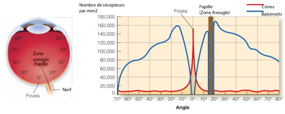 On peut voir sur la figure 3.6 la répartition comparée des bâtonnets et des cônes à l’intérieur de la rétine. Contrairement aux bâtonnets, les cônes n’ont pas tous les mêmes opsines ce qui entraîne des différences dans la sensibilité spectrale des cônes.