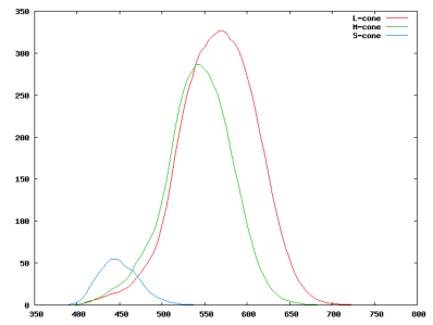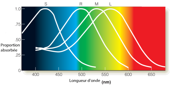 Les cônes L et M ont des sensibilité spectrales relativement proches. Sur la figure 3.7, on peut voir comment l’excitation des quatre types d’opsine de l’œil évolue en fonction de la longueur d’onde du rayonnement (on a également représenté la sensibilité de la rhodopsine (R) en plus des trois types de cônes L, M et S).