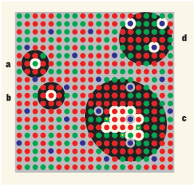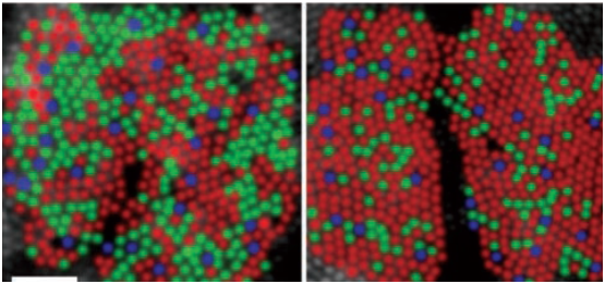 On a longtemps cru que la répartition des différents types de cônes dans la rétine était à peu près régulière et uniforme. On sait maintenant grâce aux progrès de la biologie que ce n’est pas le cas. Il y a beaucoup moins de cônes S que de cônes L et M; la répartition spatiale des cônes dans la rétine n’est pas régulière et on rencontre de façon aléatoire des zones contenant presque exclusivement des cônes L et des zones contenant presque exclusivement des cônes M (voir figure 3.8).