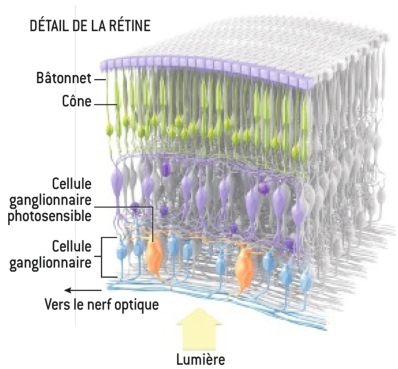 Les cônes et les bâtonnets ne sont pas les seules cellules de l’œil à être photosensibles. On sait maintenant depuis une dizaine d’années que l’œil des vertébrés et des invertébrés contient également un type particulier de cellules, appelées cellules ganglionnaires photosensibles, qui sont également capables de générer une réponse à la lumière.