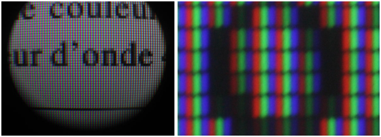 Figure 4.2: Photographie d’un écran à travers une loupe. On voit distinctement sur l’agrandissement de droite les 3 sous-pixels rouge, vert et bleu