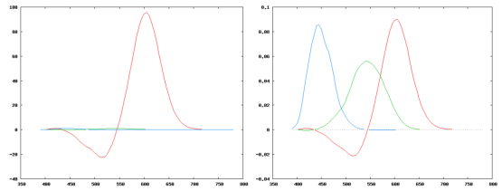 On voit à droite la représentation normalisée des trois primaires. Il faut noter que pour générer une couleur équivalente à, par exemple, une radiation à 525nm, il faudrait générer une certaine quantité de rouge négatif, ce qui est évidemment impossible.
