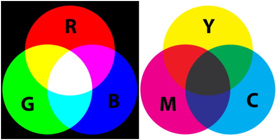 Les imprimantes quant à elles travaillent comme les peintres en synthèse soustractive. Elles utilisent des pigments qui absorbent certaines parties du spectre, d’où le nom de synthèse soustractive. La construction d’une couleur est absolument identique à celle du modèle additif, mais avec des primaires qui sont choisis comme les complémentaires des primaires du modèle additif. Le modèle additif est généralement dénommé modèle RGB pour Red (Rouge), Green (Vert) et Blue (Bleu), et le modèle soustractif modèle CMY, pour Cyan, Magenta, Yellow (jaune) (voir figure 4.4).