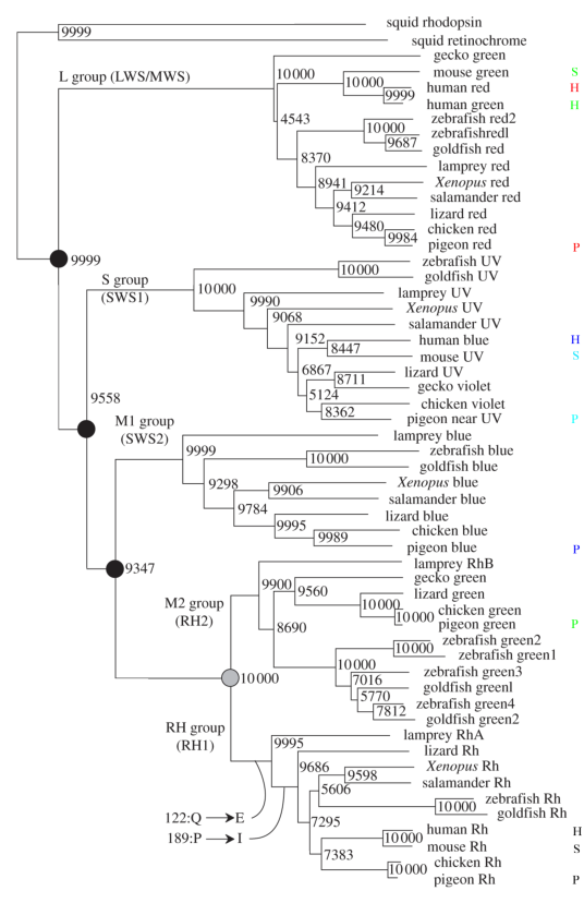 Le second gène s’est lui-même différencié en quatre groupes: SWS1 qui code les cônes bleus proches des UV et les cônes UV, SWS2 qui code les bleus proches du vert et les verts proches du bleu, RH2 qui code strictement le vert en luminosité plutôt faible, et RH1 qui code exclusivement la rhodopsine des bâtonnets: il y a donc quatre familles de gènes codant les photopsines et une famille codant la rhodopsine.