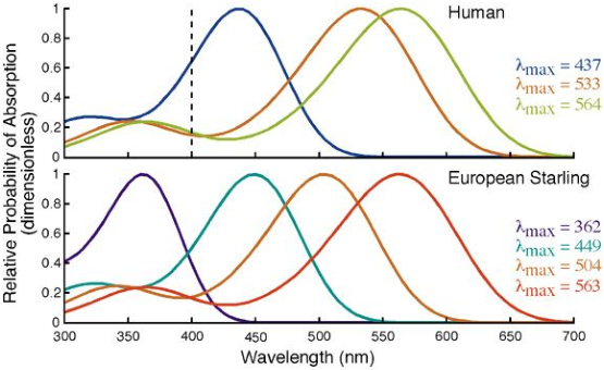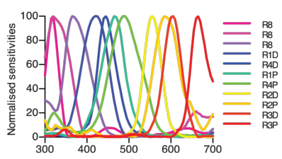 On sait par exemple que les crevettes-mantes disposent de 12 types de photorécepteurs différents (voir figure 6.11). Pourtant elles sont moins capables de distinguer des couleurs proches que l’être humain. Là où nous sommes capables de distinguer des nuances de l’ordre du nanomètre, les crevettes-mantes semblent incapables de distinguer des nuances en dessous de 20nm d’écart.