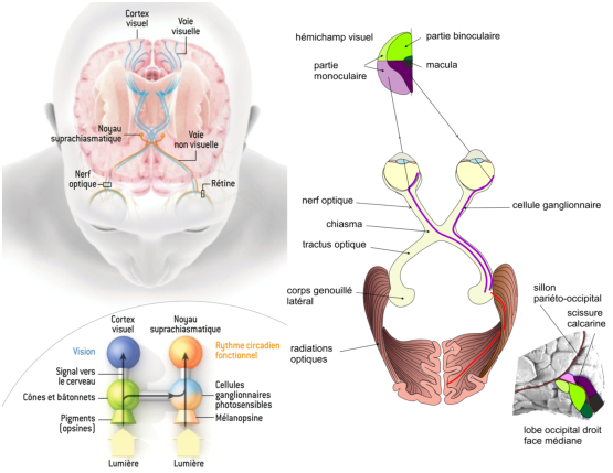 Il existe ensuite deux voies principales: la voie non visuelle et la voie visuelle. La voie non-visuelle est dirigée vers le noyau suprachiasmatique. Elle reçoit des informations des cônes et des bâtonnets, mais aussi des cellules ganglionnaires photosensibles. Cette voie est principalement impliquée dans la détermination des rythmes circadiens; le noyau suprachiasmatique est en particulier impliqué dans la détermination des cycles du sommeil, mais aussi dans la régulation de la température corporelle. Il semble que les cellules ganglionnaires photosensibles n’interviennent pas dans la voie visuelle, même si cela ne peut être complètement exclu.
