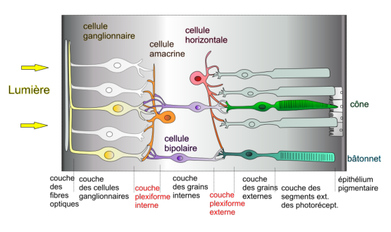 Nous reparlerons un peu du rôle de ces cellules dans le chapitre consacré au traitement de l’information par le cerveau. Elles ne sont apparemment pas impliqués dans le processus de la vision, mais dans celui des rythmes circadiens, même si les scientifiques n’excluent pas complètement qu’elles puissent aussi avoir un rôle pour la vision, comme les cônes et les bâtonnets ont un rôle dans la détermination des rythmes circadiens.