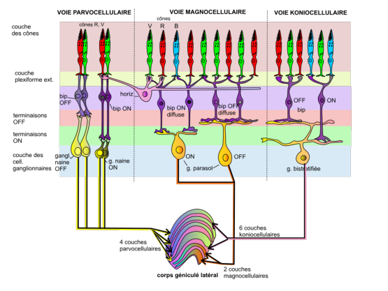 Il existe principalement trois voies permettant de transférer l’information de la rétine vers le corps géniculé latéral: