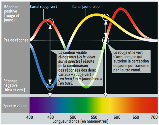 On voit aussi que l’information de chrominance transmise au cerveau est donc constitué d’un canal V−R et d’un canal B−(V+R).