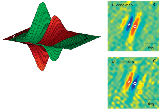 Ces cellules sont généralement raccordées à travers le CGL à des zones de taille relativement grandes de photorécepteurs. Elles sont donc particulièrement adaptées à reconnaître des différences de chrominance et ce quel que soit l’éclairage ambiant.