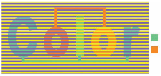 Le “C”, le “l” et le “r” de “Color” sont tous de la même couleur turquoise . Le “C” et le “r” sont traversés de bandes violettes, alors que le “l” est traversé par des bandes jaunes. Associé avec du jaune, le turquoise parait plus jaune, ce qui est incohérent avec la théorie qui voudrait que cela renforce le contraste avec le bleu, et qu’il devrait donc paraître davantage bleu et non davantage jaune.