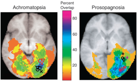 On teste alors des patients souffrant d’achromatopsie et des patients souffrant de prosopagnosia, et l’on essaie de voir quelles zones du cerveau ont été détériorés par un accident ischémique en les comparant avec des patients ayant une vision normale de la couleur et de la reconnaissance des formes.
