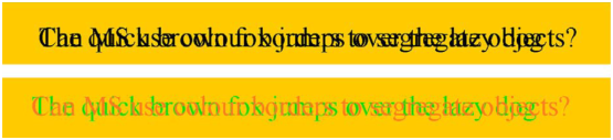 Figure 6.14: Deux phrases superposées, l’une en noir sur noir et l’autre en rouge sur vert. Une personne normale pourra lire la seconde mais pas la première. Un achromate “rétinal” ne pourra lire ni l’une ni l’autre. Certains achromates cérébraux peuvent lire la seconde comme s’ils percevaient la couleur, bien qu’ils soient incapables de distinguer la moindre différence de couleur. (extrait de [KHC04])