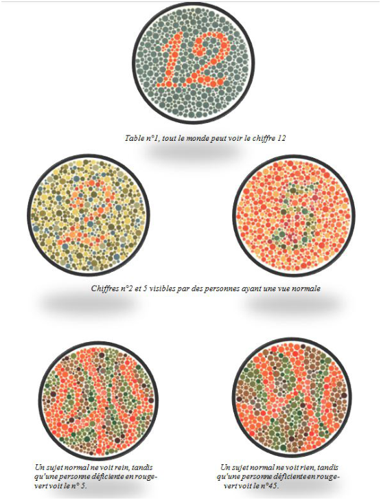 Quelqu’un dont la vue présente certaines différences sera soit incapable de lire ces nombres, soit sera capable pour certaines planches de distinguer des nombres qui sont invisibles pour quelqu’un ayant une vision des couleurs normale.