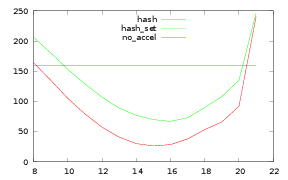 On figure 1, we have the result of the experimentation. The x-axis is the size of the hash table in bits, the y-axis the time needed to solve the 13243 instances. The blue plot is the time without hash tables, the red one the time with a simple array hash table and the green one the time with an array containing sets to hold all numbers.