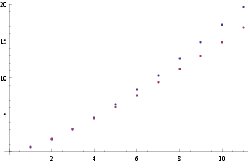 The other idea comes from the complexity study which provides a hint: when the size of the sets of available numbers increases, the game becomes apparently extremely difficult. If we use the complexity formulas of sections 2.2 and 2.3, we plot (figure 2) in blue the log10 of the number of operations required by the depth first algorithm and in red the same quantity for the breadth first algorithm.