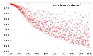 We have dmin(9)/dmin(8)=108 and bmin(9)/bmin(8)=48. Thus the standard depth first algorithm should take more than 6000s to solve a single instance and the breadth first algorithm with arrays should need around 40Gb of memory, that the computer used for these tests don’t have.